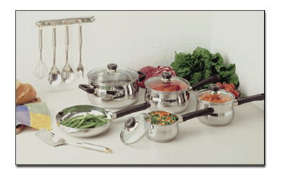 cookware and utensil set featuring "Look While You Cook" glass covers. The