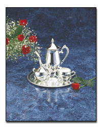 Sterlingcraft Silverplated 5pc Tea/Coffee Set - Never needs Polishing Set includes tea/coffee server, creamer, sugar bowl with lid and a 12" round tray. The tray can double as a serving tray or cake plate. Gift Boxed 5 lbs. REGULAR PRICE $84.95----OUR PRICE $54.95